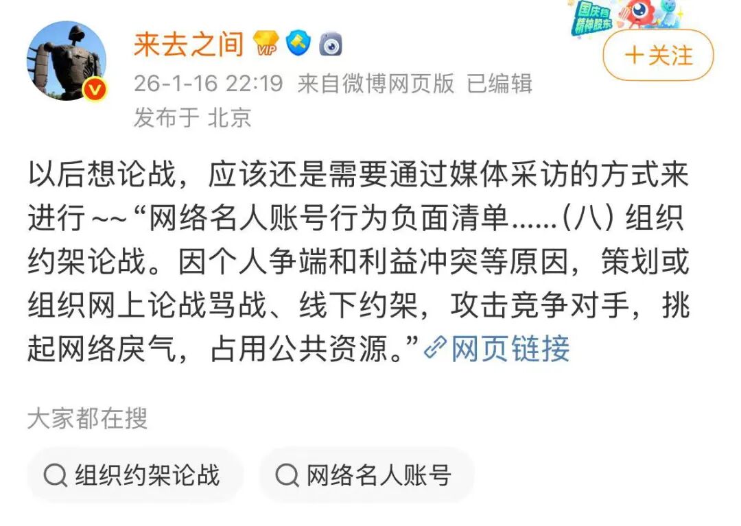 1月16日22点19分,微博CEO“来去之间”在个人首页发布微博表示“以后想论战,应该还是需要通过媒体采访的方式来进行~~”,并附上“网信中国”2025年12月26日发布的《关于规范网络名人账号行为管理的通知》中“网络名人账号行为负面清单”第八条:“组织约架论战。因个人争端和利益冲突等原因,策划或组织网上论战骂战、线下约架,攻击竞争对手,挑起网络戾气,占用公共资源。”