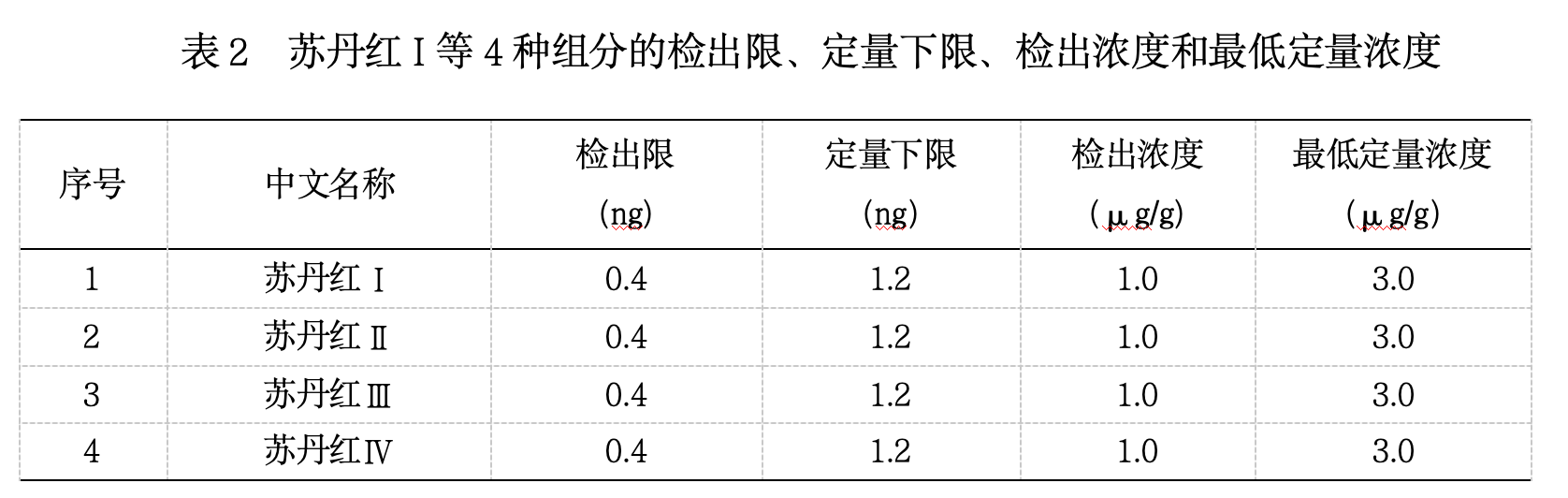 在检测标准上,《化妆品安全技术规范2015版本》对苏丹红Ⅱ、Ⅳ的检出限为 3μg/g(3ppm),最低定量浓度分别为6μg/g(6ppm)和7μg/g(7ppm)。而此次发布的苏丹红补充检验方法中,对苏丹红I、II、III、IV的测定的检出浓度则均为1μg/g(1ppm),最低定量浓度为3μg/g(3ppm),与GB/T 34806-2017《化妆品中13种禁用着色剂的测定高效液相色谱法》保持一致,并新增了对苏丹红I和III的同等严格限定。