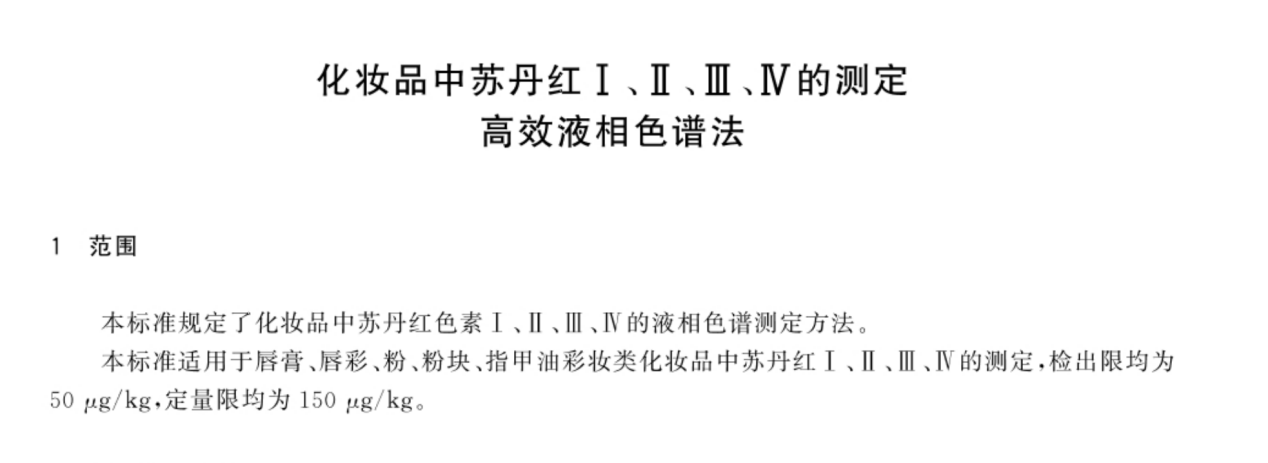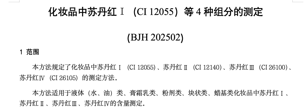1月12日,国家药品监督管理局正式批准并公布了《化妆品中苏丹红I(CI 12055)等4种组分的测定》化妆品补充检验方法,为相关监管与检测提供了明确依据。该方法适用于液体(水、油)、膏霜乳、粉剂、块状及蜡基类化妆品,可测定苏丹红Ⅰ、Ⅱ、Ⅲ、Ⅳ四种组分的含量,公告同步公布了检测原理与具体操作步骤。
