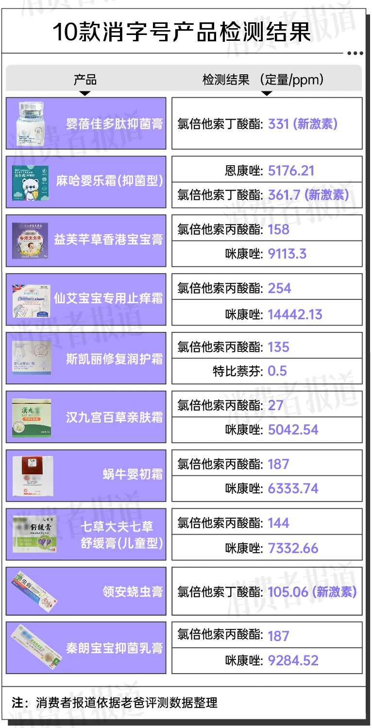 在此基础上,该博主将相关产品连同另外9款儿童面霜、抑菌膏一起送往第三方机构进行检测。结果显示,上述产品均检出禁用激素,其中婴贝佳多肽抑菌膏、麻哈婴乐霜(抑菌型)、领安蛲虫膏3款产品被检出氯倍他索丁酸酯,另外7款产品则被检出氯倍他索丙酸酯。