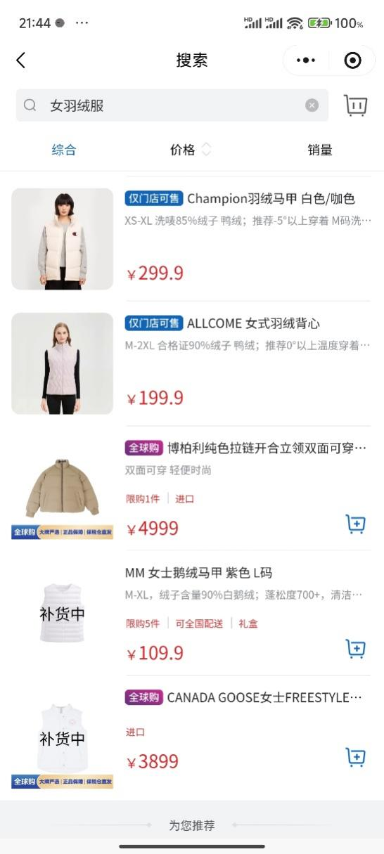 同时,山姆会员商店小程序也显示,这款RR女士经典羽绒服已断货。且其余多款女士羽绒服、羽绒马甲均显示在补货中,售价从109元到3899元不等。