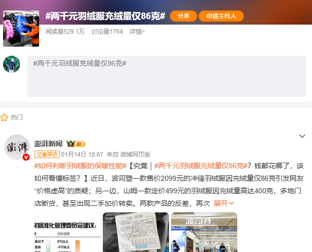 另一方面,波司登一款售价2099元的冲锋羽绒服因充绒量仅86克引发不少消费者“价格虚高”的质疑。“两千元羽绒服充绒量仅86克”话题一度冲上社交平台热搜。其实,早在2023年,“国产羽绒服卖到7000元”话题就曾登上微博热搜第一,引起消费者对国产羽绒服价格的关注和讨论。