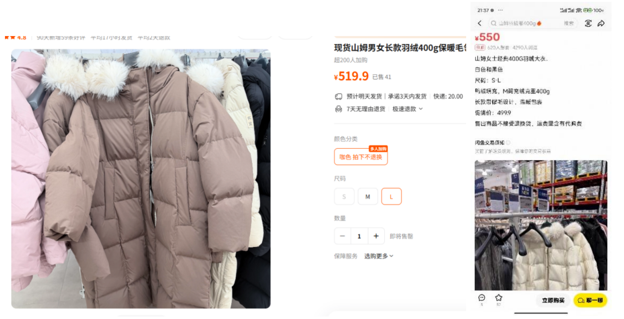 而在某电商平台,这款原价499元的山姆羽绒服已加价到519.9元(不包邮)出售,且只有棕色款式有货。在某二手平台,白色款式的该款羽绒服还有货,但已加价到550元,溢价50元左右。
