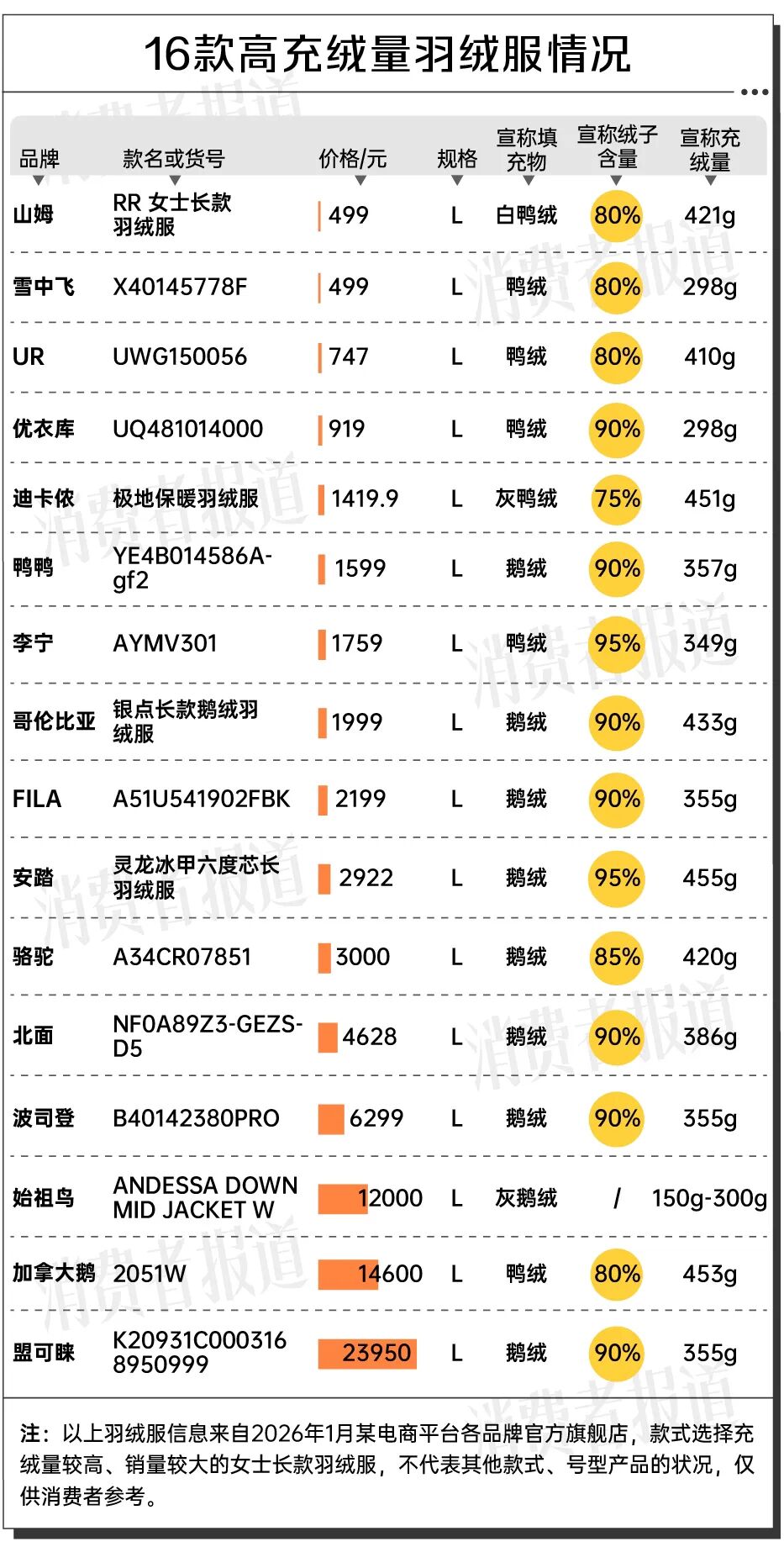 为此,《消费者报道》记者统计了市面上多款高充绒量的女士长款羽绒服(L码)的售价情况,对比充绒量、绒子含量、填充物等指标。