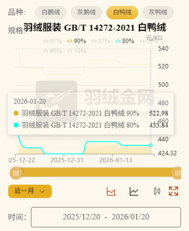 原料价格的波动是羽绒服售价的重要影响因素之一。羽绒价格自去年10月份以来不断走高。羽绒金网数据显示,今年1月20日,绒子含量为90%的白鸭绒和灰鸭绒的价格均同比增长15%以上,达522.98元/kg和516.66元/kg,分别为一年中的中高位和高位。