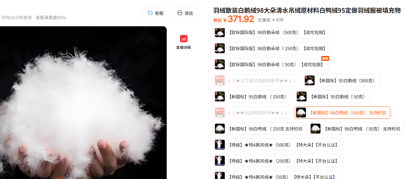 记者搜索发现,在电商平台上就有散装鸭绒、鹅绒售卖,可供消费者购买后自行填充制作羽绒服或羽绒被。其中一家销量较大的店铺产品页面显示,500g的散装“98白鸭绒”售价为370元。但是,不同品质的羽绒售价存在较大差异,另一家店铺在售的500g的散装“80白鸭绒”售价仅120.5元。