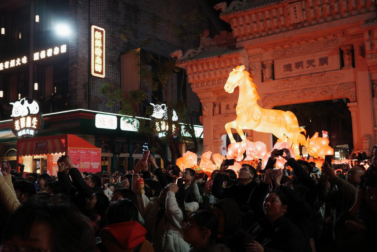 在华侨城欢乐海岸PLUS,园区匠心打造了岭南吉市、水上花市、非遗赶潮集等特色市集,推出长桌宴等沉浸式特色体验场景,并组织了醒狮巡游、粤剧展演等民俗活动。此外,马年之际,园区特别设计了“马上”系列主题打卡动线,其中以腾飞骏马为核心元素的5米高“马上鸿运来”主题装置,成为游客拍照打卡的必到点位。