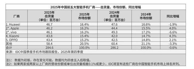 不过,在中国市场,华为以4670万台出货量、16.4%的市场份额,登顶全年榜首。IDC数据显示,2025年全年,中国智能手机市场出货量约2.85亿台,同比下降0.6%。出货量前五的手机厂商分别为华为(4670万)、苹果(4620万)、vivo(4610万)、小米(4380万)、OPPO(4340万)。值得关注的是,苹果、小米是前五厂商中增长最快的两家,同比增速分别为4.0%和4.3%,而vivo降幅较为明显,并从2024年的出货量第一滑落至2025年的第三位,被华为、苹果反超。