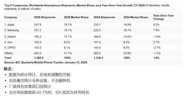 在关税波动、供应链扰动以及多国宏观经济承压等背景下,全球智能手机市场展现出强劲韧性。IDC数据显示,2025年全年,全球智能手机出货量达到12.6亿部,同比增长1.9%。其中,出货量前五的手机厂商分别为苹果(2.48亿部)、三星(2.41亿部)、小米(1.65亿部)、vivo(1.04亿部)、OPPO(1.02亿部)。其中,苹果、三星是TOP5厂商中增长最快的两家,同比增速分别为6.3%和7.9%。