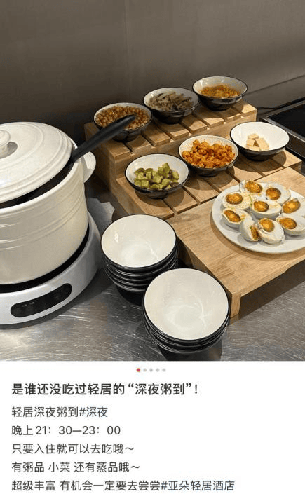 “深夜粥到”与“夜宵”服务曾是吸引易安选择亚朵轻居的重要因素。她透露,此前入住时,夜宵大概毎三晚会点一次;与夜宵质量的参差不齐不同,大部分亚朵轻居门店的粥品稳定,口味不错。