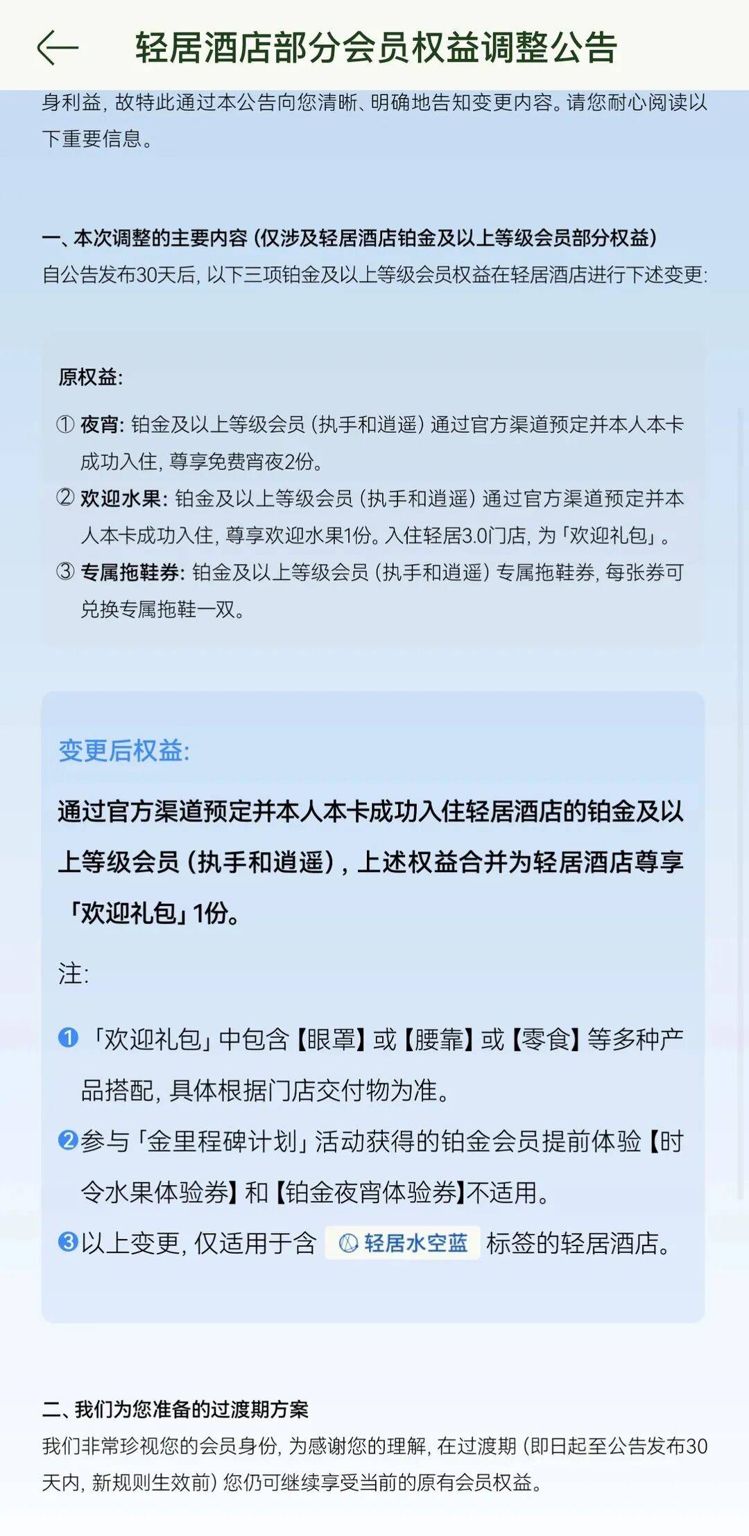 《轻居酒店部分会员权益调整公告》 图源:受访者供图