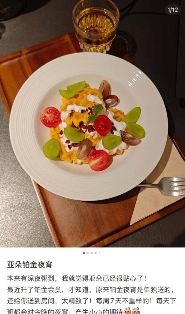 “虽然铂金权益一直在缩水,但淡季的亚朵轻居确实便宜——2025年12月初,定了杭州某亚朵轻居,5晚才1100元。这个价格下,也不是不能接受取消夜宵。”易安(化名)在社交平台上分享了自己的看法。不过,她在接受《消费者报道》记者采访时表示,取消铂金夜宵尚可接受,但希望能保留“深夜粥到”。