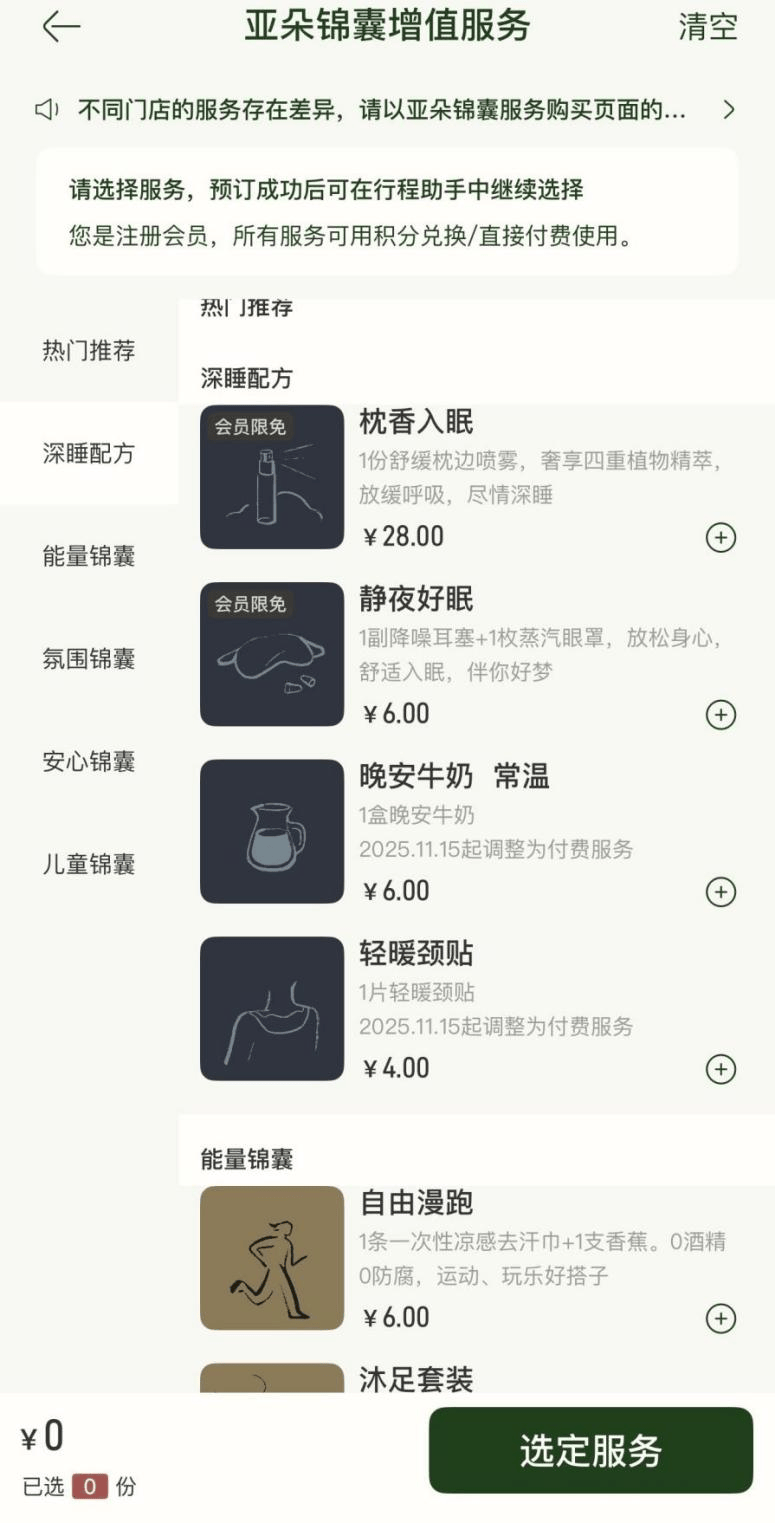 亚朵APP显示,不同会员等级对应不同的亚朵锦囊会员限免额度,如银会员1份免费、金会员2份、铂金会员3份……而在亚朵锦囊增值服务中,“晚安牛奶”“轻暖颈贴”这两项服务已标注“2025年11月15日起调整为付费服务”,价格分别为6元/盒,4元/片。