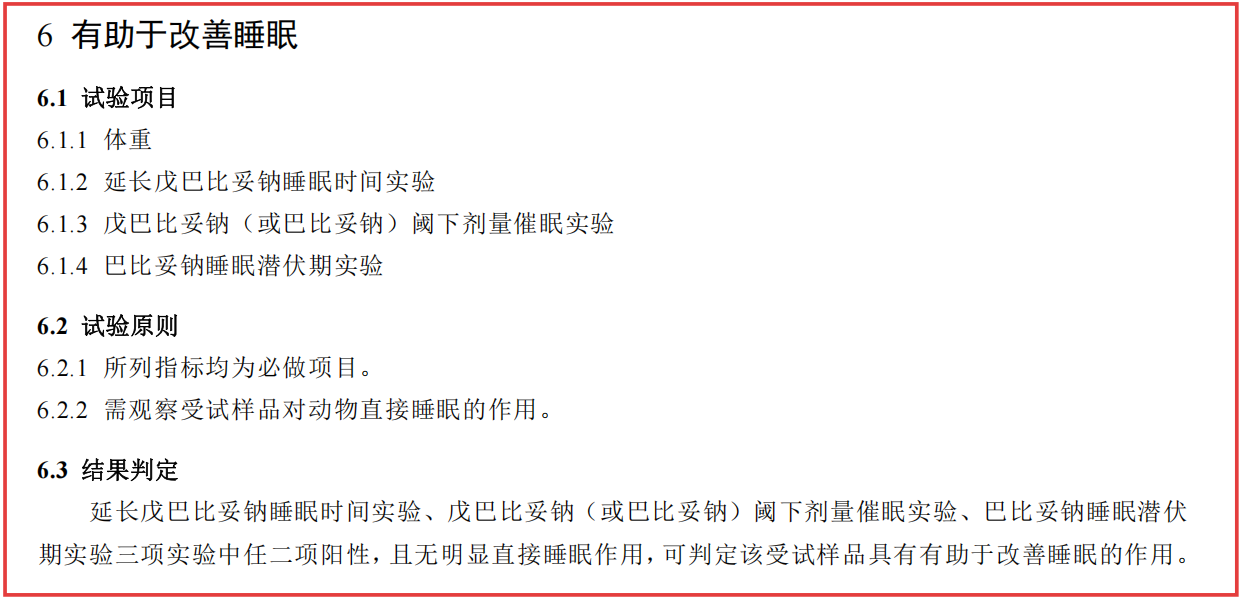 依据《保健食品功能检验与评价方法(2023年版)》,在改善睡眠功能的评价中,若延长戊巴比妥钠睡眠时间实验、戊巴比妥钠(或巴比妥钠)阈下剂量催眠实验、巴比妥钠睡眠潜伏期实验三项实验中任二项阳性,且无明显直接睡眠作用,可判定该受试样品具有有助于改善睡眠的作用。这些实验中所使用的戊巴比妥钠和巴比妥钠,是药理学研究中常用的镇静催眠模型药物,用于模拟和评价受试物对睡眠的调节作用。