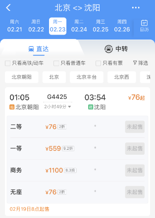 高铁方面,可关注铁路部门推出的折扣车次。今年铁路部门继续对部分非热门路线实行优惠票价,最大折扣低至2折。不同类别的车次折扣有所差异,优惠主要集中在高铁动车的二等座、普速列车的硬座及硬卧,且发车时间也集中在夜间时段。例如2月23日,北京-沈阳G4425车次的二等座票价仅为76元,相当于原价的2折。
