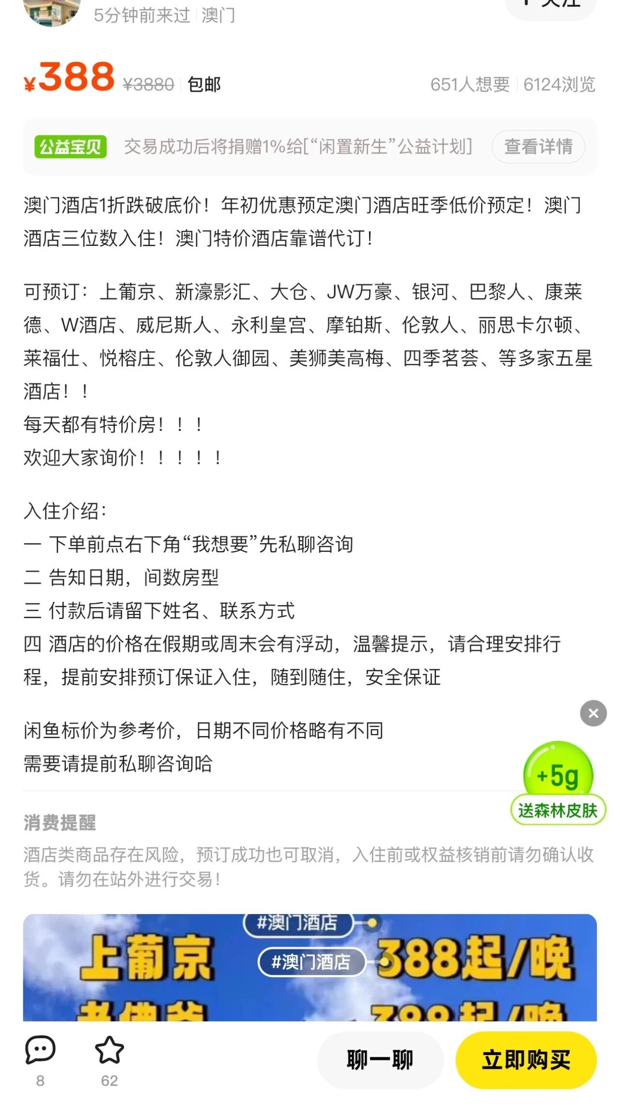 《消费者报道》记者调查发现,二手平台一名等级为L7的卖家主推中国澳门酒店超低折扣的代订服务,其发布的代订信息中标注着“澳门酒店1折跌破底价”“每天都有特价房”等吸引眼球的字眼。L7级用户通常是售出量大、好评率高的卖家,在平台信用等级的背书和低价诱惑下,不少消费者纷纷咨询下单。