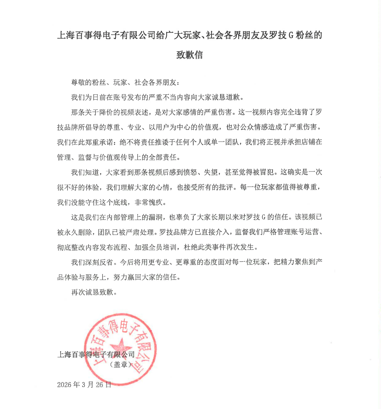 目前,罗技已删除上述视频,并于3月26日23时许发布了致歉声明,称“关于降价的视频表述是对大家感情的严重伤害,也对公众情感造成了严重伤害。团队已被严肃处理,我们深刻反省”。