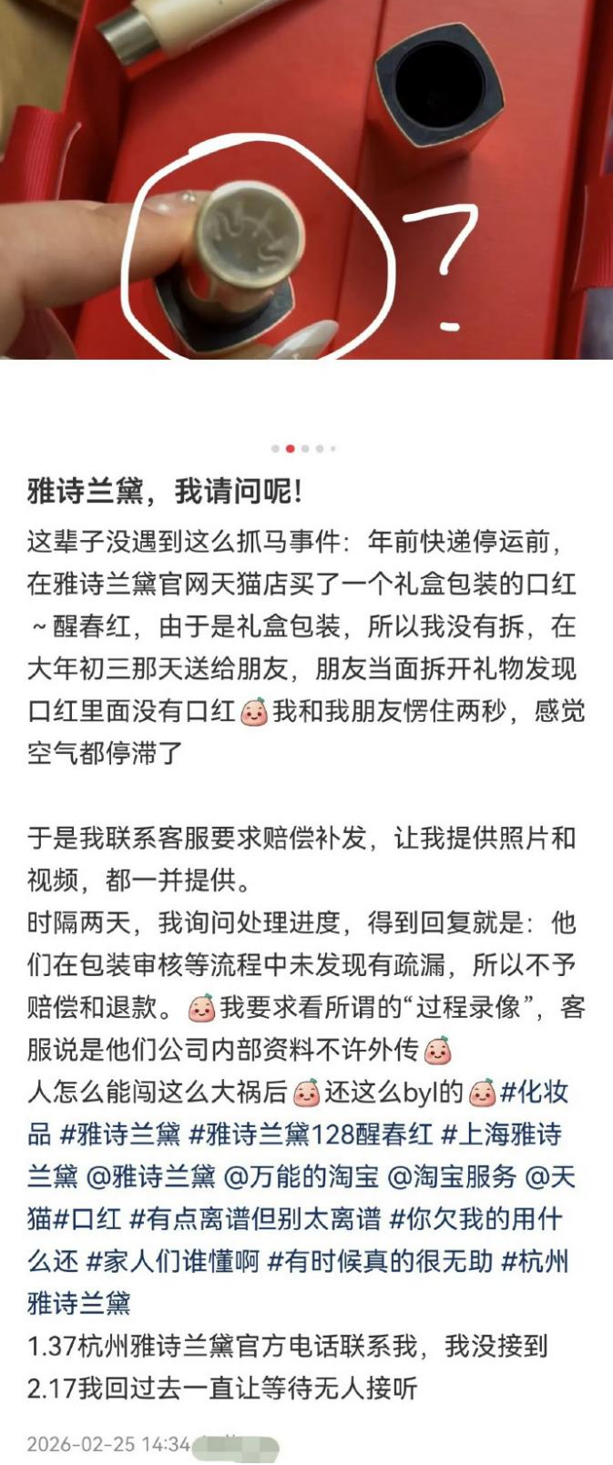 近日,多家媒体报道,消费者朱女士在雅诗兰黛官方旗舰店花费360元购买了一支礼盒装口红,收货后未立即拆封。直到赠予朋友时,发现礼盒内仅有口红外壳和一个粉底液小样赠品,口红内部并没有膏体。