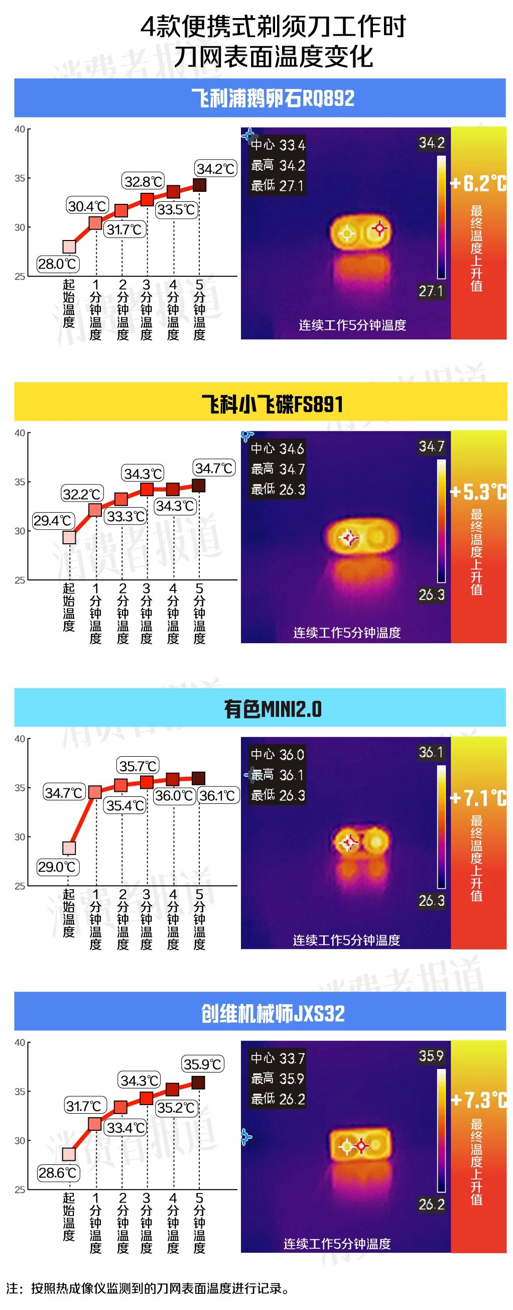 实测数据显示,4款剃须刀在连续工作5分钟后,刀网的温度上升值相差不大,在5.3℃-7.3℃的区间。虽然温升速度差距不明显,但可能影响敏感肌用户的剃须体验。其中,有色MINI2.0的温度上升速度较其他3款快,连续工作5分钟后刀网表面温度最高,达到36.1℃。