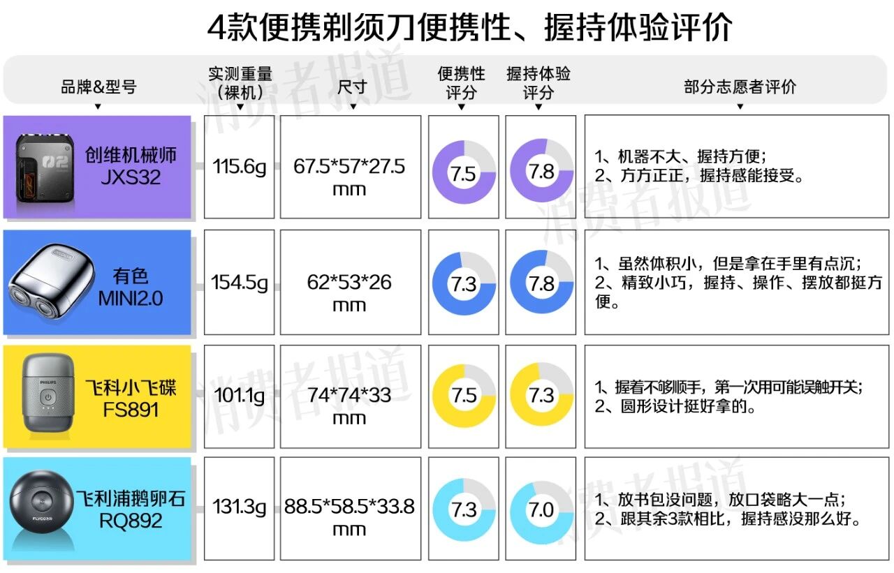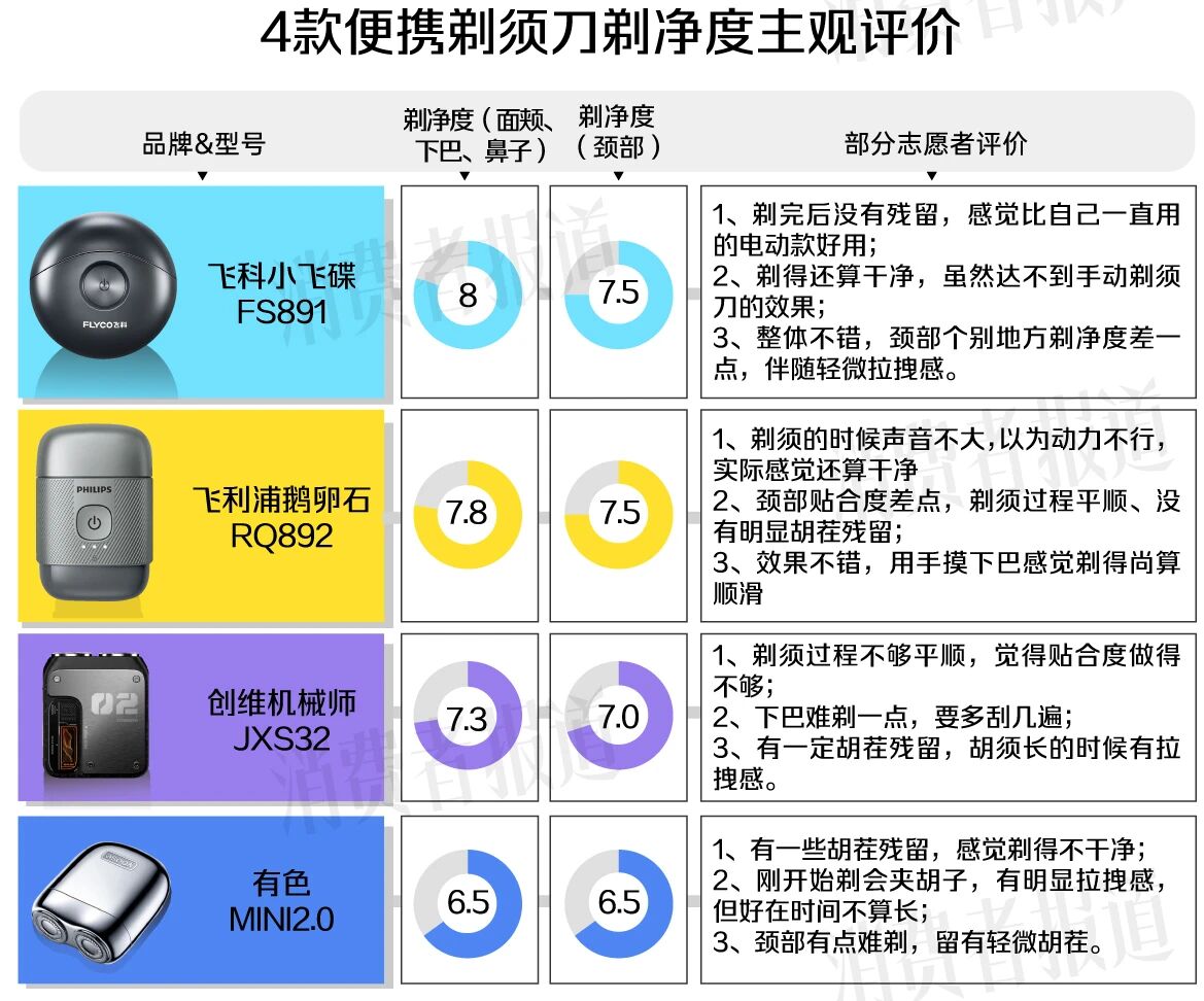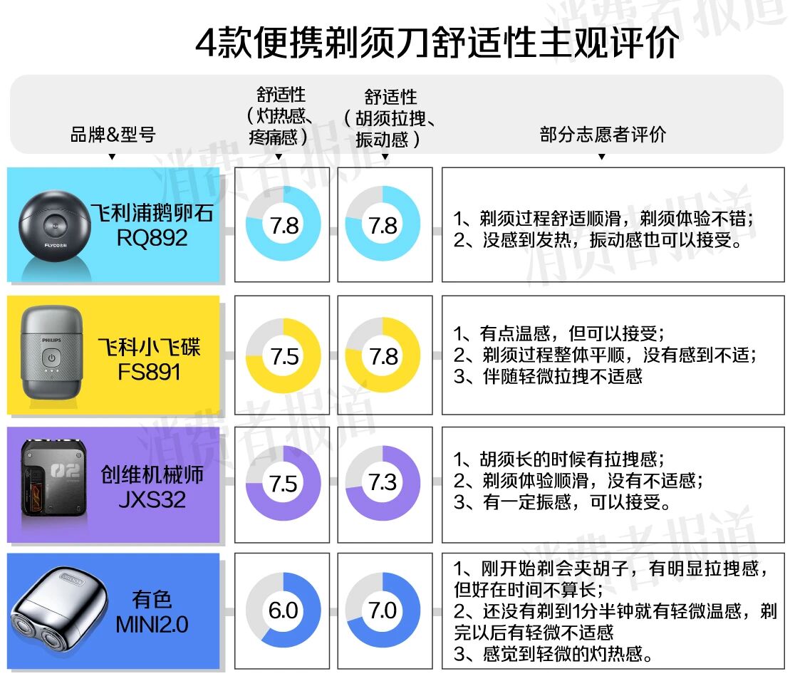 注:1、文中“便携剃须刀”特指“便携电动剃须刀”。2、文中主观评价均由志愿者主观体验得出。
