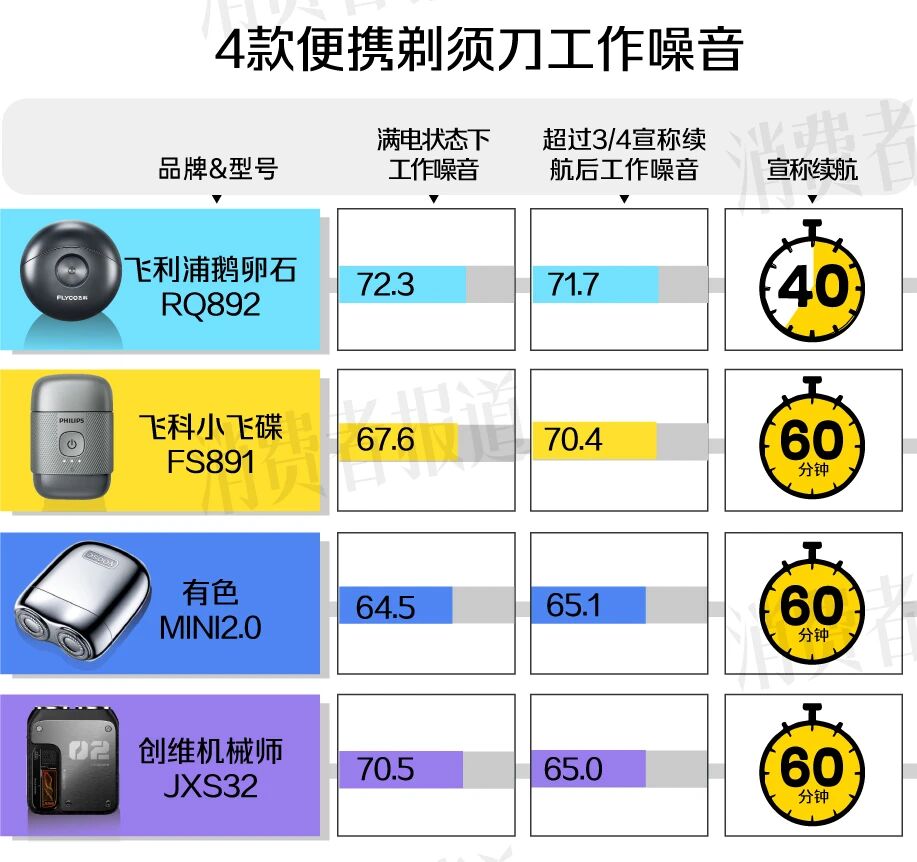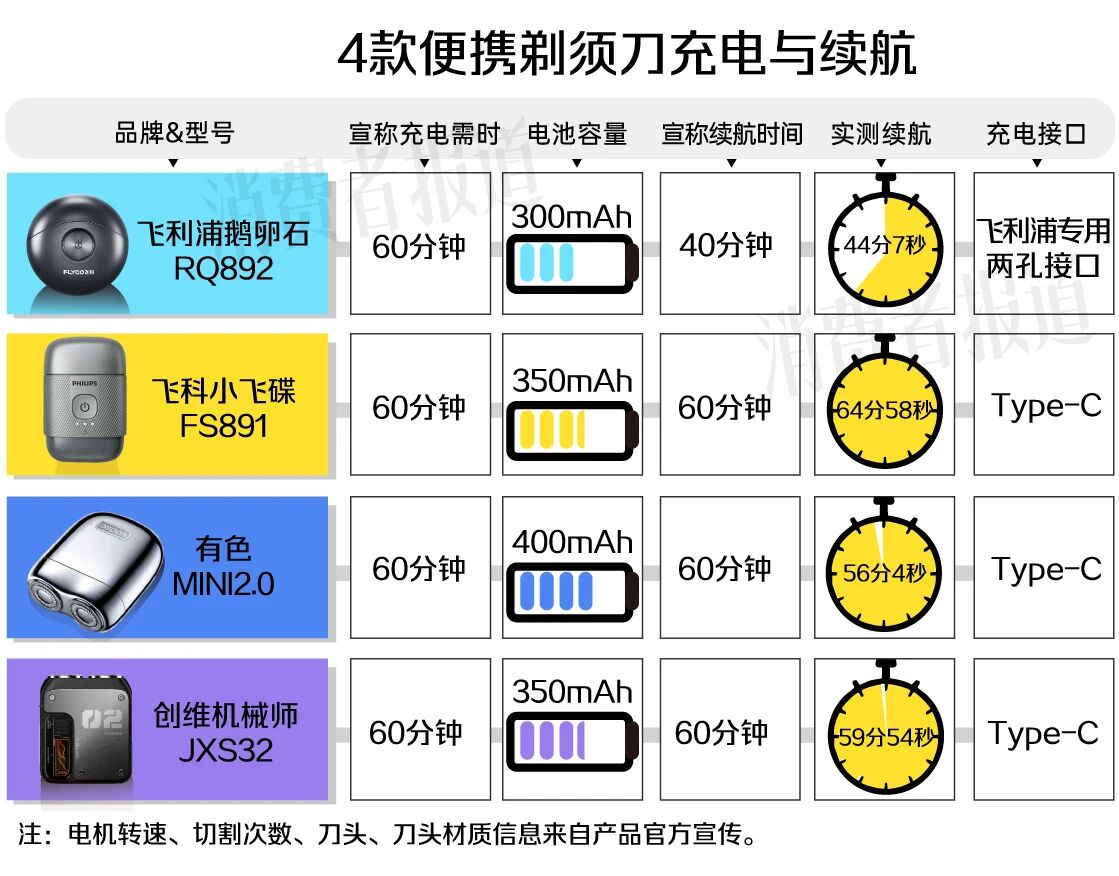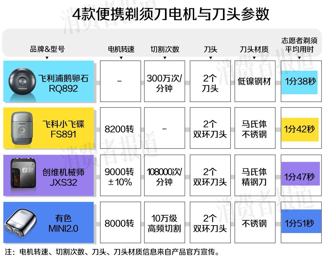 理论上双环刀头的进须面积更大,剃须效率更高。不过,志愿者使用4款便携剃须刀的平均用时其实相差不大。