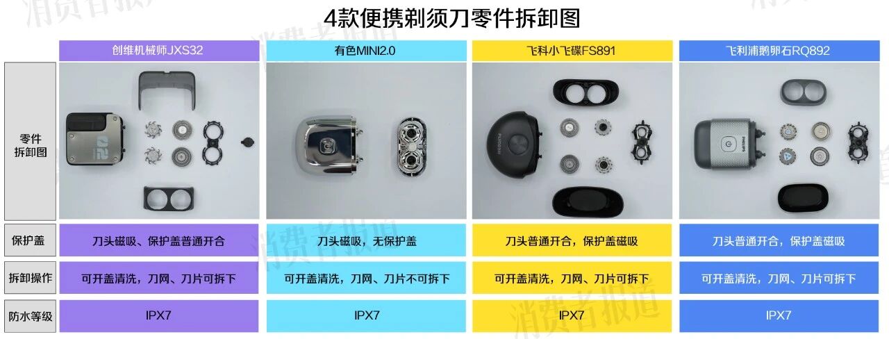 4款便携剃须刀的保护配置 图源:《消费者报道》摄