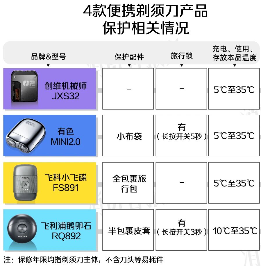 4款产品的保护配置各有差异:飞科小飞碟、飞利浦鹅卵石都提供了较好的包裹保护;有色MINI2.0的小布袋只能提供简单的软性保护,加上没有刀头保护盖,如果书包里有硬物,可能会磕碰到刀头;创维机械师则只有刀头保护盖,没有为机身提供包裹保护。