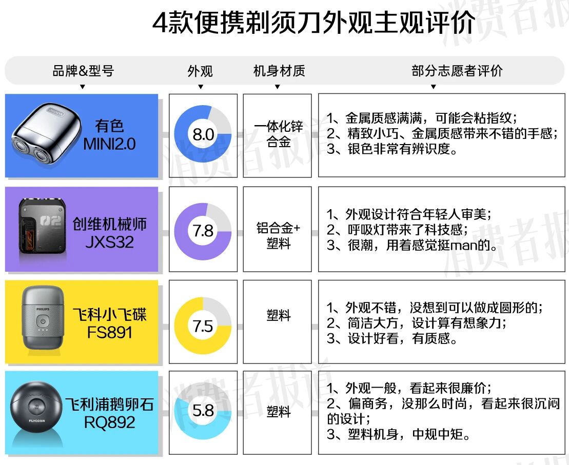 主观评价中,飞利浦鹅卵石因设计简单、偏商务,在4款便携剃须刀中得分最低。有志愿者认为其设计沉闷,塑料机身带来廉价感。另外3款国产品牌则可圈可点:有色MINI2.0采用一体化锌合金机身,极具辨识度;创维机械师采用“塑料+金属”机身,并搭载了呼吸灯,带给用户一定科技感;飞科小飞碟采用了飞碟设计,打破了旋转式剃须刀固有的设计印象。