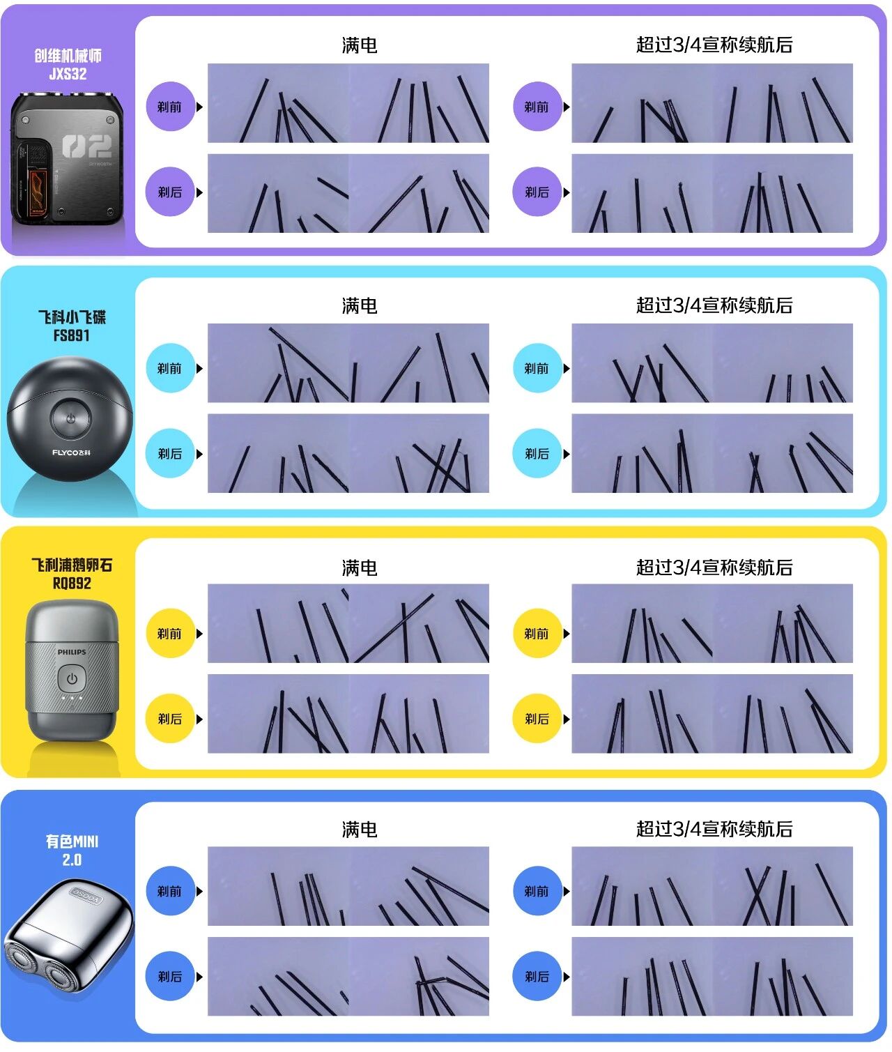 不过,锋利度测试也暴露出个别产品的不足。飞科小飞碟、有色MINI2.0、创维机械师分别在其中一组切割试验里出现切割不完整的情况,这也解释了为何主观评价中有志愿者反馈这3款剃须刀存在“胡须拉拽感”的问题。