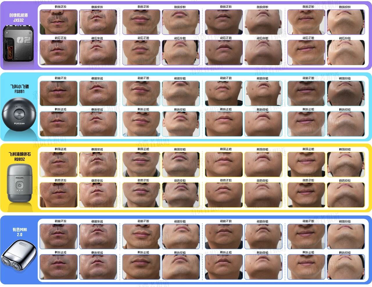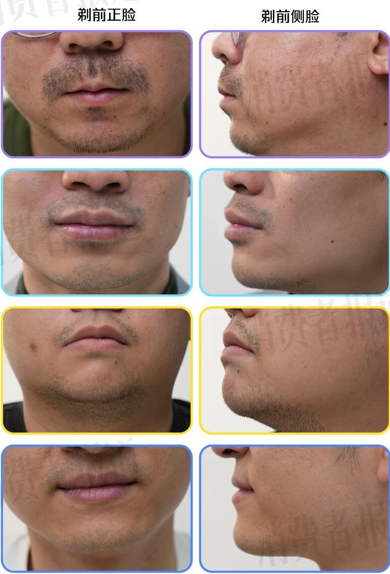 衡量剃须效果最直接的方法是“真人试用”。消道长筛选了4位不同胡须类型的志愿者,让他们轮流体验4款便携剃须刀,每款体验周期为3天,全程拍照记录。剃须体验评价问卷参考QB/T 2532-2001《家用电动剃须刀性能测试方法》设计。