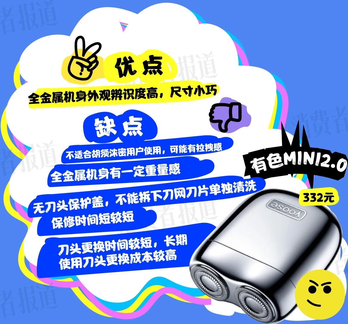 不同产品的清洁便利性也有差异。如有色MINI2.0的刀头为磁吸设计,虽然拆卸方便,但刀片和刀网均不能单独拆下清洗,用户只能用刷子在水流下对拆出的完整刀头进行刷洗。