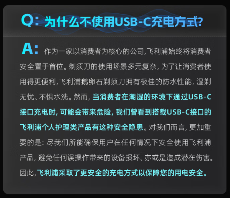 相比之下,飞利浦采用的专用两孔充电接口适配性稍逊一筹。对此,官方解释称“为保障用电安全”:消费者在潮湿的环境下通过Type-C接口充电可能会带来危险,曾看到搭载Type-C接口的飞利浦个人护理类产品有这种安全隐患。