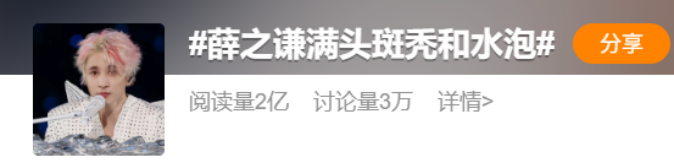今年4月8日,薛之谦也在社交媒体上直言“很痒的头,其实第一天演出前我头发都染断了,满头斑秃和水泡,硬挺了一周没洗头”。随后,相关话题登上了微博热搜,评论区有不少网友认为斑秃和水泡是薛之谦反复漂染头发引起的。
