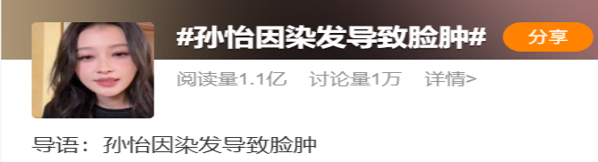 去年9月,孙怡在直播中讲述,自己上次染发后整个脸都肿起来,去医院挂了两天水,脸都肿得见不了人。她还表示对染发膏过敏,每次染头都要吃过敏药,可能是染的次数太多了,吃过敏药也不管用……随后,相关话题也登上了微博热搜。