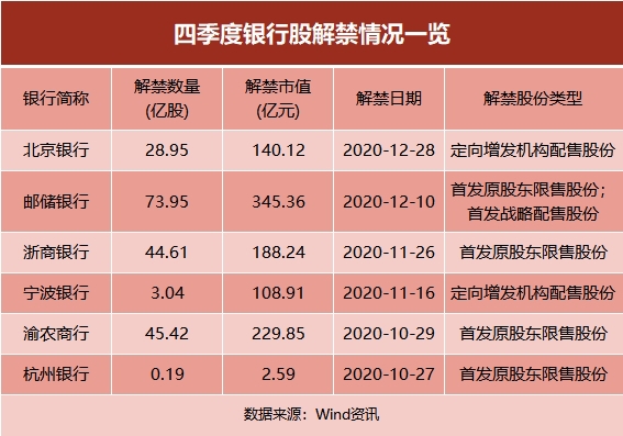 数据显示,10月29日起的两个月内,合计有渝农商行、宁波银行、浙商银行、邮储银行、北京银行、杭州银行6家银行迎来限售股解禁,其中有5家解禁市值都在百亿以上,合计解禁规模超过千亿。(详情见下表)