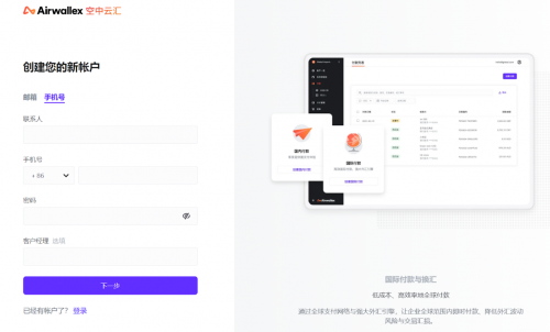 2.跳转至 Airwallex注册页面,使用手机号(推荐)或者邮箱注册账户;